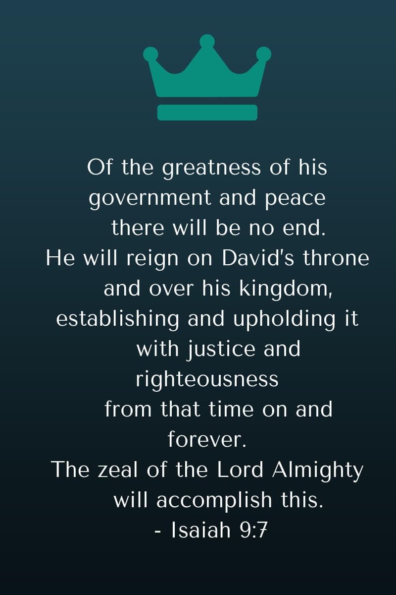 That’s how serious God was about His plan. Back to that passage in Isaiah, that little word, “will” says it all: God will accomplish His purposes. There will be no end to this coming kingdom. The Heir Apparent will rule with righteousness and justice. We can have confidence that God will do whatever He sets out to do. He is determined to make it so.