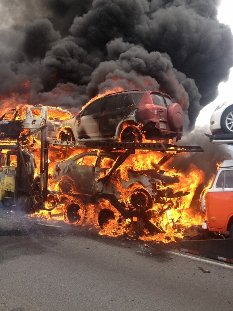 - Sunday, while my sister, brother-in-law and daughter were driving down I-10, they had to pass by an auto transport semi engulfed in flames. The fire was so intense, they could feel the heat through the closed windows and heard strange popping sounds. Needless to say, they were quite shook afterwards.