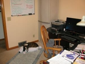 After living in a house for eight years and after my two daughters had moved to college, I decided to turn a bedroom into an office and make it my own. I painted the room a pretty coral color, lined the walls with my favorite art, and added sea-foam green curtains and rugs. It was beautiful.