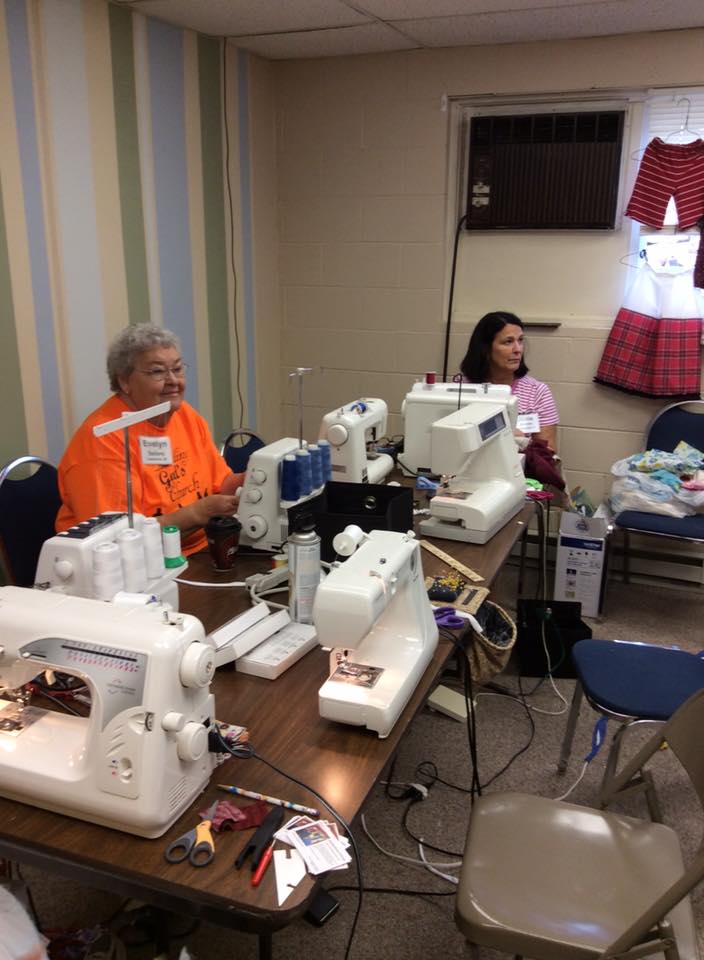 The vast supply of fabrics you see in the picture is mostly donated. “A retired teacher friend who’s been an avid quilter gave us about 100 yards this time,” Dianne said. “We also watch yard sales for t-shirts for the t-shirt dresses.” The women make dresses for little girls out of t-shirts and pillowcases. They gladly accept donations of new or gently used t-shirts and pillowcases as well as fabric, elastic, decorative buttons and other sewing notions. If you would like to donate supplies, email me and I’ll get you in touch with Dianne.